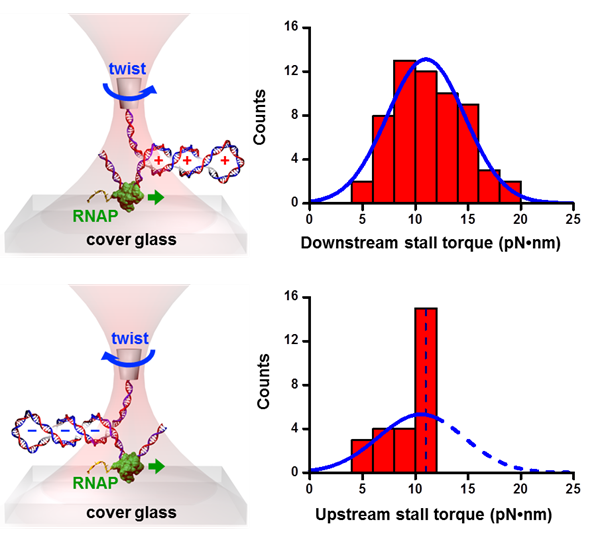 Because we observed that RNAP backtracking limits RNAP torque generation capacity, we considered whether transcription factors such as GreB, which rescues backtracking, could increase torque generation capacity. We found that GreB greatly limits RNAP backtracking and increases torque capacity by 65% (to 18.5 pN∙nm) and through de novo sophisticated statistical mechanics analysis of the stalling trajectories and determined the kinetic rates of backtracking and GreB rescue (Ma et al, bioRxiv, 2018). |