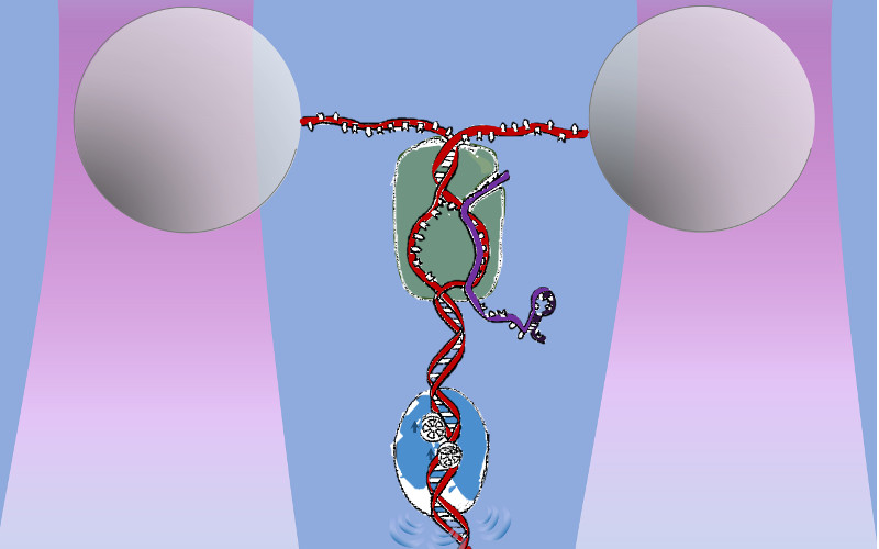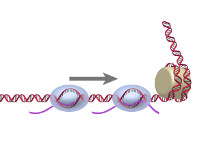 RNAPDuring transcription, RNA polymerase must access DNA, however nucleosomes can impose a substantial barrier to transcription elongation as they may induce RNAP pausing and arrest due to backtracking. We directly monitored RNAP and showed that histone-DNA interactions dictate RNAP pausing behavior and a trailing RNAP may reduce backtracking and enhance transcription of a leading RNAP. This alleviation of nucleosome-induced may serve as a mechanism for overcoming the nucleosomal barrier in vivo (Jin et al., NSMB, 2010). |